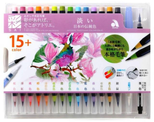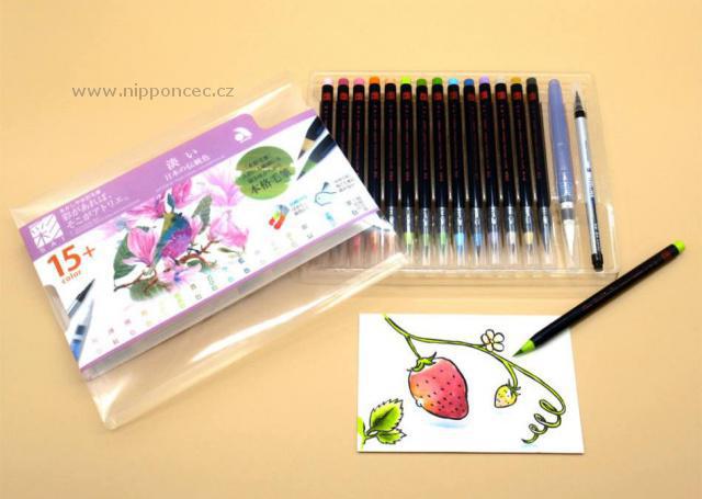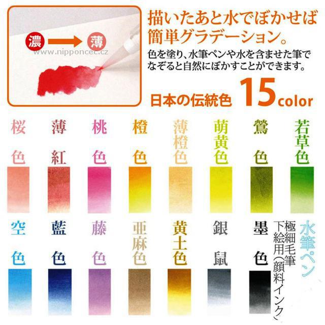 Barvy - tradiční pastelové japonské odstíny: třešňový květ, světlečervená, broskvově růžová, oranžová, světle oranžová, žlutozelená, hnědozelená, zeleň jarní trávy, azurová, indigo, fialová visteria, ekru, béžová, stříbřitě šedá plus štětcové pero plnitelné vodou a černé obrysové štětcové pero ThinLine, odolné vůči vodě a vyblednutí.