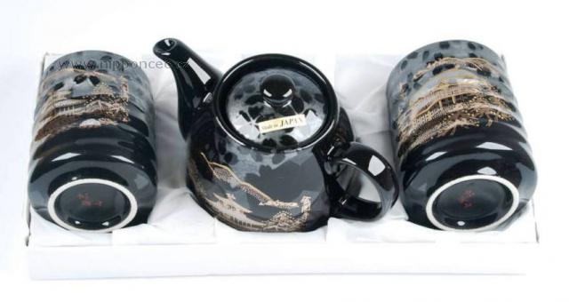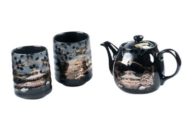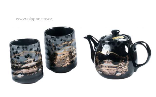 Souprava na čaj Sakura Black se skládá z konvičky a dvou šálků. Je ideální pro přípravu všech druhů čajů. Originální sada je vyrobena z černé glazované keramiky s vyobrazením Zlatého pavilon Kinkakuji - světoznámá kjótská památka. Zlatý pavilon v Kyoto je je dvoupatrová budova, přízemí je vybudováno v aristokratickém stylu šinden-zukuri, první patro ve stylu buke-zukuri, druhé patro patří zenové architektuře. První a druhé patro je zcela pokryto tenkými plátky čistého zlata. Ve Zlatém pavilonu jsou také uchovávány části ostatků Buddhy.