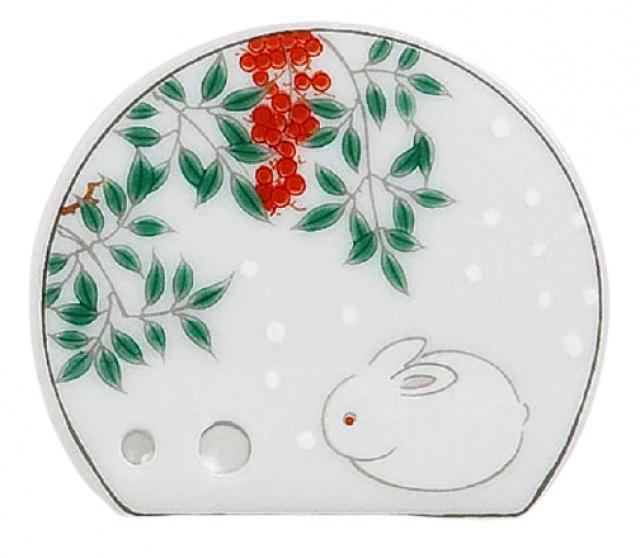 Vysoce kvalitní porcelánový držák vonných tyčinek s vyobrazením zajíčka, schovávajícím se v zimě pod keř s červenými bobulemi, vhodný pro všechny typy vonných tyčinek od společnosti Shoyeido.