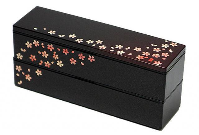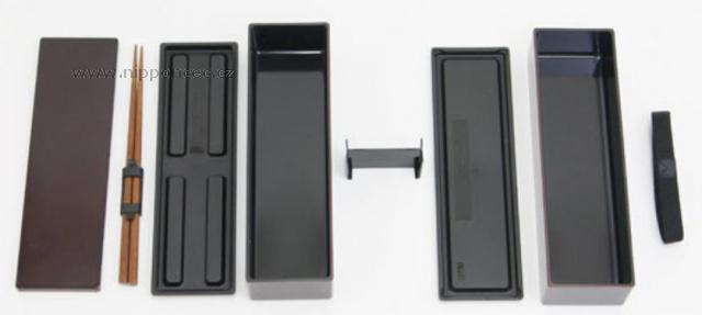 Každé patro má svoje vlastní víčko, které chrání vnitřek obsahu krabičky před vytečení a proto lze patra používat současně nebo zvlášť - dle toho, jak velký hlad máte. Součástí je také vnější víko, vnější elastická guma, vyjímatelný rozdělovač a dřevěné hůky. Bento je navržené tak, aby se hůlky perfektně vešly do vnitřního víka horního patra. Interiér benta je černý, exteriér má nádech dřeva s motivy sakury, květy třešně.Krabička je vyrobena z PET, ABS plastu a proto je vhodná do mikrovlné trouby nebo myčky nádobí, ale je doporučené ji mýt v ruce. Není vhodná do trouby.