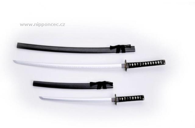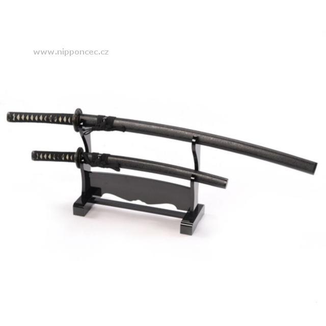 Katana set - elegantní dekorace do bytu, kanceláře nebo do prostorů pro výuku bojového umění. Skládá se ze dvou nenabroušených mečů (katana, wakizashi) a z dřevěného lakovaného stojanu v černé barvě.