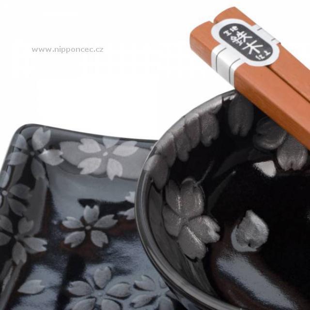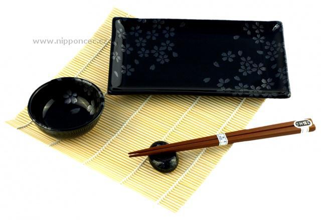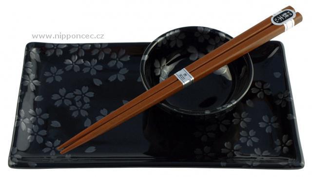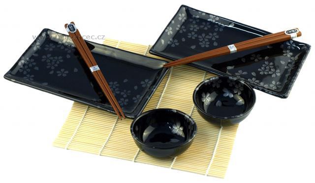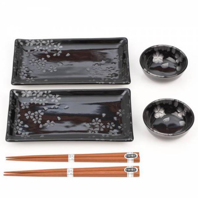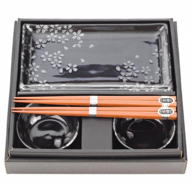 Japonský keramický sushi set Ginsai s květinkovým vzorem se skládá ze dvou talířů, 2 misek na omáčku a 2 párů jídelních hůlek. Dodáváme v elegantní dárkové krabičce.