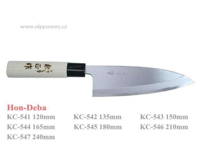 Kvalitní japonský kuchyňský nůž Hon-deba je vhodný k čištění a filetování celých ryb i k porcování a úpravě masa s malými kostmi jako je například drůbeží maso. Jádro ostří je vyrobeno z bílé oceli #3. Zdobená rukojeť je vyrobena ze dřeva magnolie.