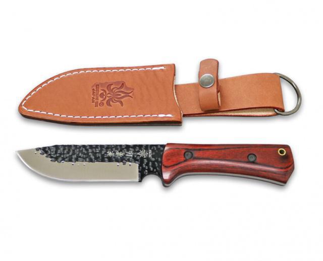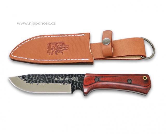 Japonský nůž Kanetsune model Enyou-Tou KB-166 s pevnou čepelí o délce 12 cm a tloušťce 5 mm je vhodný pro outdoorové aktivity a pobyt v přírodě. Černě zbarvený povrch Tsuchime (typ japonské povrchové úpravy) je vyroben z jednovrstvé nerezové oceli AUS-8. Pohodlný a stabilní úchop poskytuje rukojeť z kvalitního polywoodu. Nůž se dodává s koženým pouzdrem, které bezpečně kryje čepel, můžete jej nosit aktivně na opasku pomocí poutka nebo zavěsit na D-kroužek.