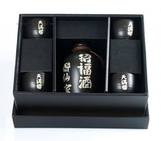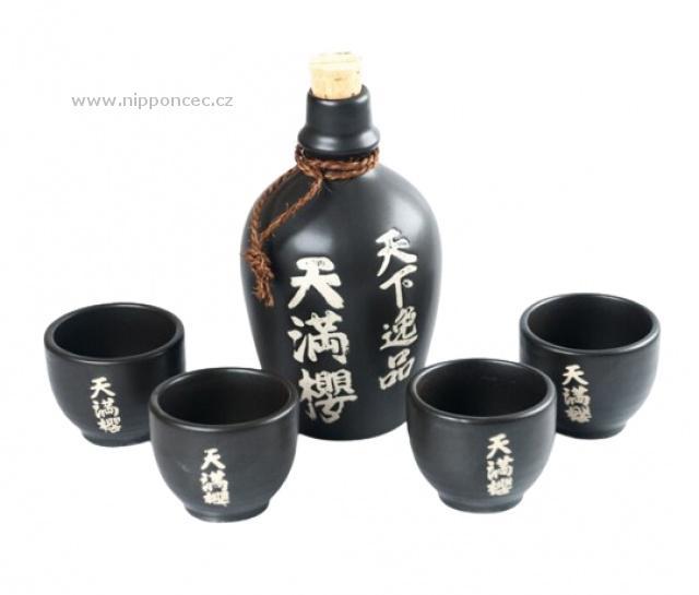 Saké set Tenman Sakura se skládá z láhve na saké "takkuri" a čtyř pohárků s glazurou v odstínech tmavě hnědé, s dekorem. Set je vyrobený z porcelánu. Baleno v dárkové krabičce.