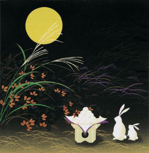 Vícebarevný šátek s motivem zajíčků, kteří se kochají pohledem na měsíc při měsíčním úplňku v době podzimního festivalu Tsukimi (cuki = měsíc, mi - ru = dívat se). Bíle rýžové koule dango symbolizují poděkování za bohatou úrodu.
