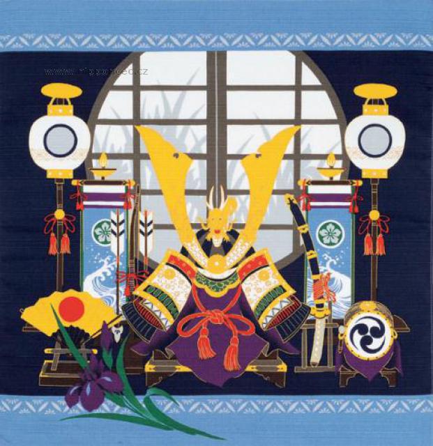Vícebarevný šátek s motivem svátku chlapců. Kabuto je helma samurajů.