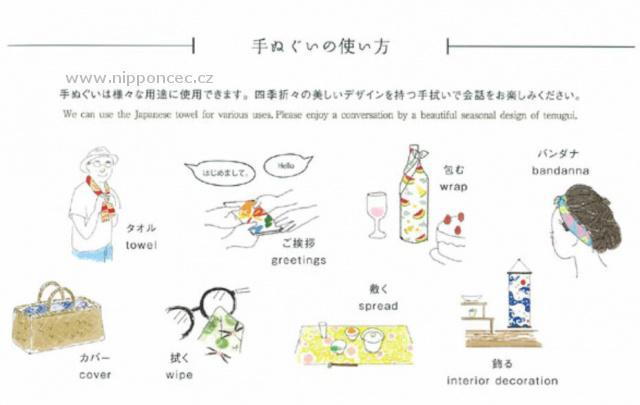 Tenugui se v historickém Japonsku používaly s erbem rodu místo vizitek. Jde o typický japonský suvernýr. Nyní vám může japonské tenugui posloužit jako malý ručník, pás na čelo, šátek, využijete jej při sportu kendo, jako pásek či na dekorační účely....