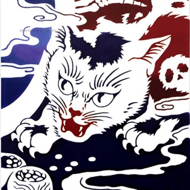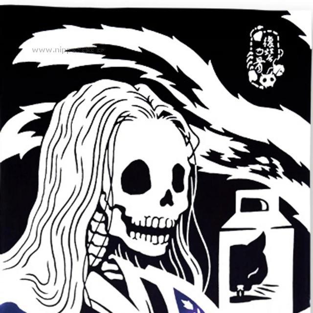 Originální japonský tenugui s výrazným motivem inspirovaným světem yōkai a strašidelnými příběhy (kaidan). Na látce se objevuje hrozivý kostlivec v kimonu a démonická kočka (bakeneko). Tenugui se v historickém Japonsku používaly s erbem rodu místo vizitek. Jde o typický japonský suvenýr. Nyní vám může japonské tenugui posloužit jako malý ručník, pás na čelo, šátek, dekorace či eko balení dárků nebo jej využijete při sportu kendo, jako pokrývku hlavy.