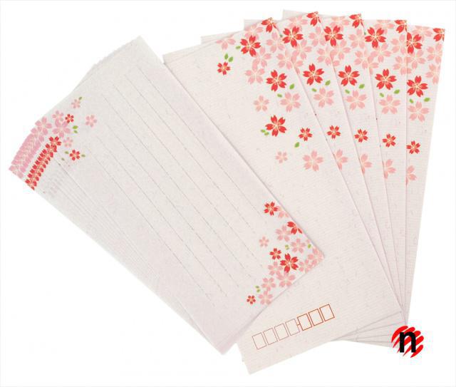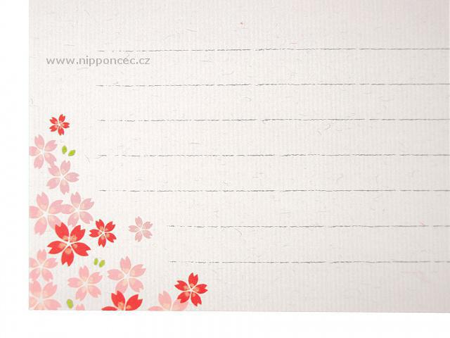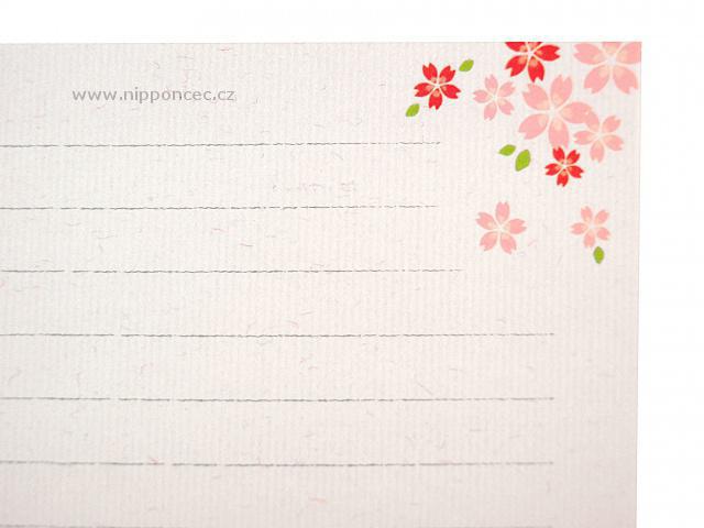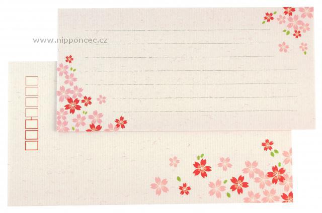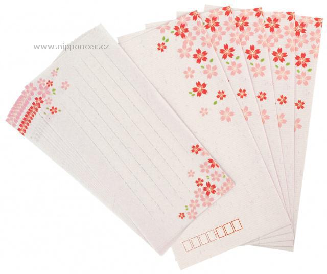 Sada dopisních papírů s obálkami - set papírů "Tonbo" Sakura. Balení obsahuje 6 obálek a 10 listů jemného dopisního papíru (17 cm x 8,5 cm). V bílé barvě, se vzorem růžových a fialových třešňových kvítků.