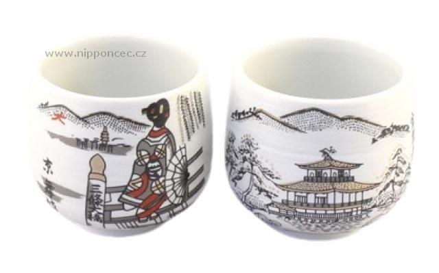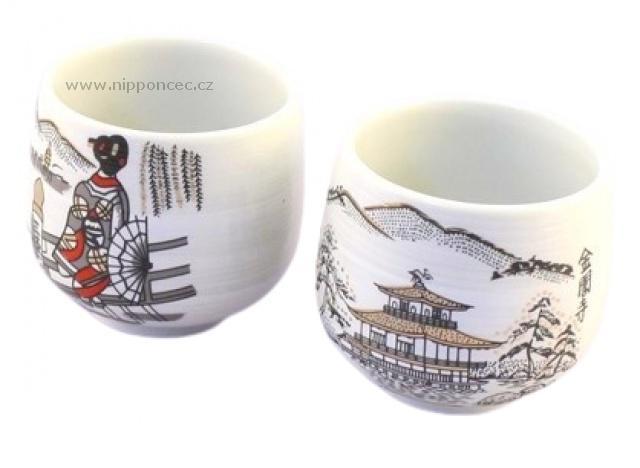 Čajový set Hakame - to jsou dva pohárky na čaj z glazované keramiky - v bílé barvě, s dekorem. Na pohárcích je vyobrazen Zlatý pavilon Kinkakuji - světoznámá kjótská památka. Zlatý pavilon v Kyoto je je dvoupatrová budova, přízemí je vybudováno v aristokratickém stylu šinden-zukuri, první patro ve stylu buke-zukuri, druhé patro patří zenové architektuře. První a druhé patro je zcela pokryto tenkými plátky čistého zlata. Ve Zlatém pavilonu jsou také uchovávány části ostatků Buddhy. Druhý ze šálků znázorňuje Gejšu v tradičním kimonu.