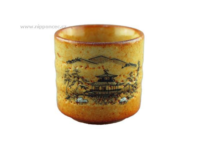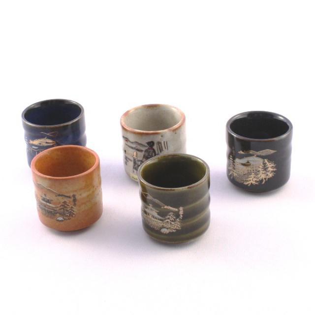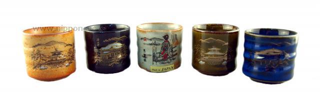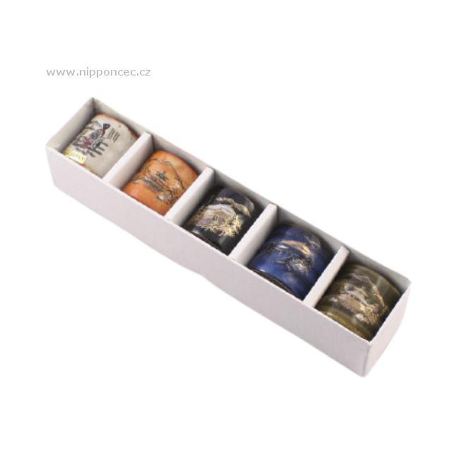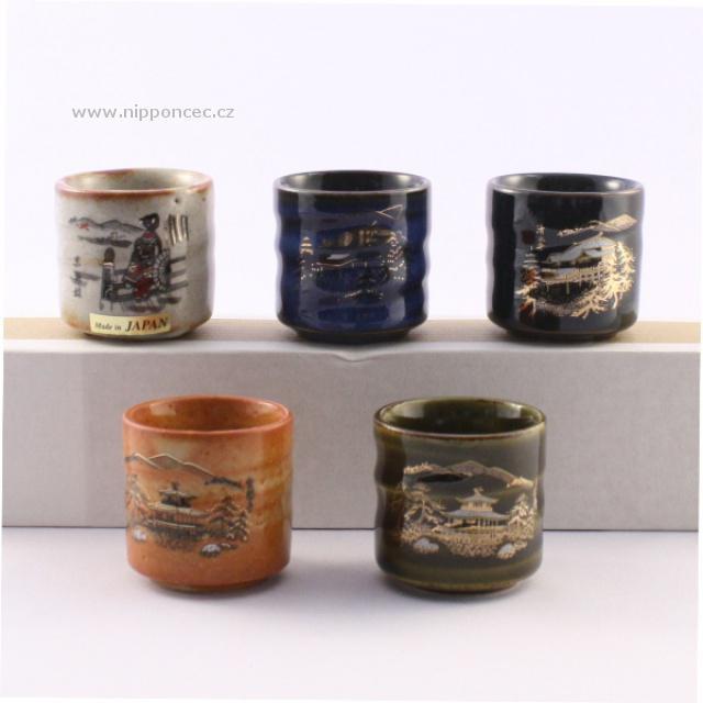 Saké set Kiritachi - to je pět pohárků o rozměrech 4,5 cm x 4,5 cm x 4,5 cm, s barevnou glazurou a vyobrazením slavných japonských památek nebo symbolů. Dodává se v elegantní dárkové krabici.