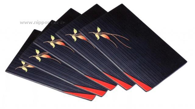 Set pěti talířů Mizuhikiso - ruční práce, vysoce lesklý, lakovaný přírodním lakem Uruši, která dodá japonský styl prostřenému stolu. Dekorovano tradičním japonským motivem - jemným vzorem květin mizuhiki (Polygonum filiformni) v levém dolním rohu. Dodáváme v dárkové krabičce. Talíře mají pravý roh v červené barvě mírně ohnutý směrem nahoru - jde o tradiční japonský designový prvek, u nás zřídka užívaný. Talíře jsou vyrobeny z přírodního dřeva.