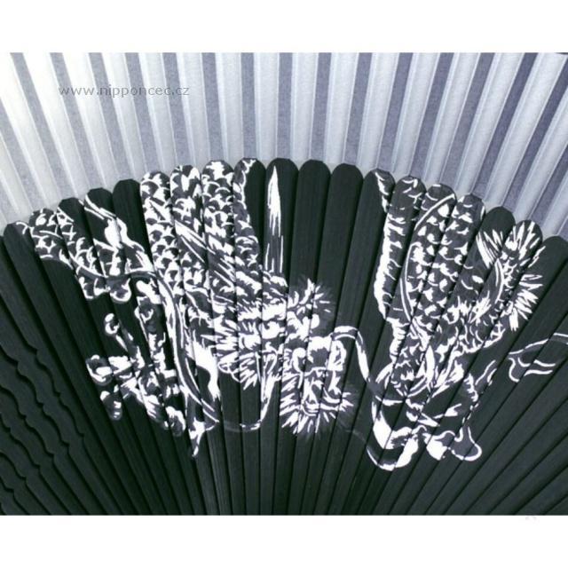 Půvabný originální japonský vějíř v černé barvě s motivem stříbrného draka. Luxusní vzhled, vyrobený dle tradice z bambusového dřeva a hedvábí. Součástí balení je i kárované pouzdro na vějíř.