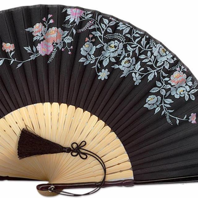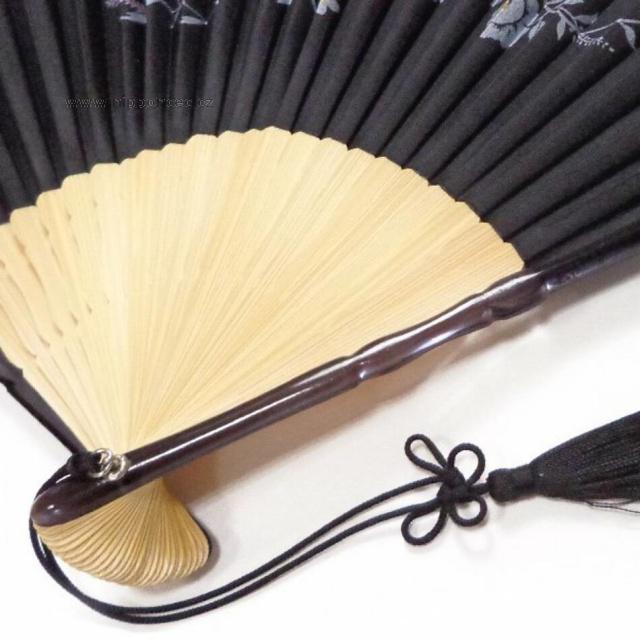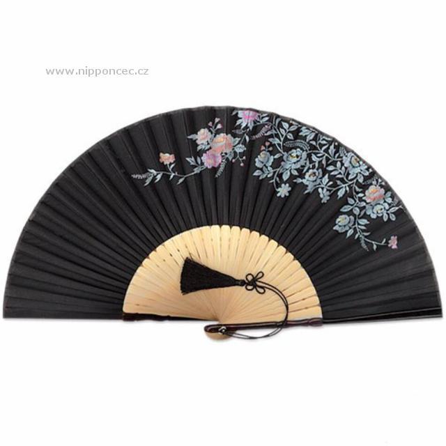 Ručně vyrobený elegantní vějíř v černé barvě je zdoben motivem růží a stříbrného listí. Vějíř je vyroben dle tradice z bambusového dřeva a hedvábí a je dodáván v dárkové krabičce se zlatými znaky. Velikost vějíře je 21 cm.