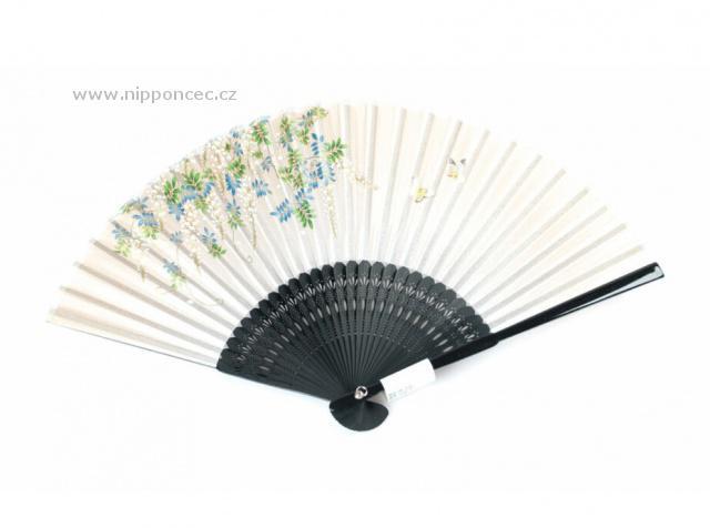 Elegantní japonský vějíř laděný do černé barvy s motivem květů a motýlů je vyrobený dle tradice z bambusového dřeva a hedvábí.