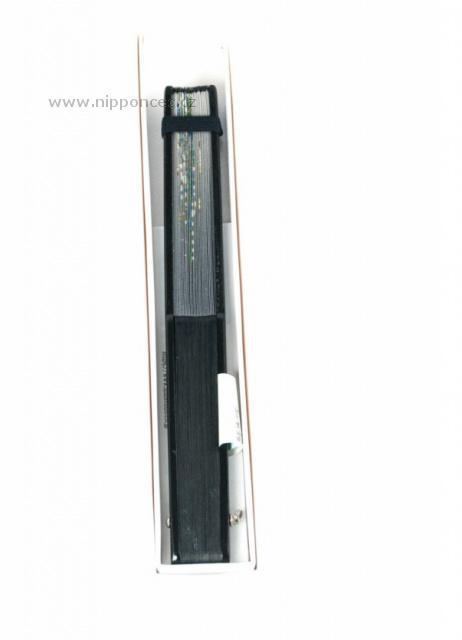 Elegantní japonský vějíř Sútra s motivem budhistického svatého písma psaného zlatou barvou na černém pozadí. Sútra znamená doslovně vlákno nebo provaz, který drží věci pohromadě. Sútry vznikaly od nejstarších dob jako koncentrovaná, pro zapamatování vhodná vyjádření důležitých filozofických, náboženských i specializovaných odborných obsahů.