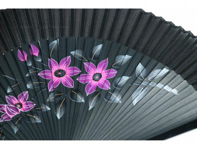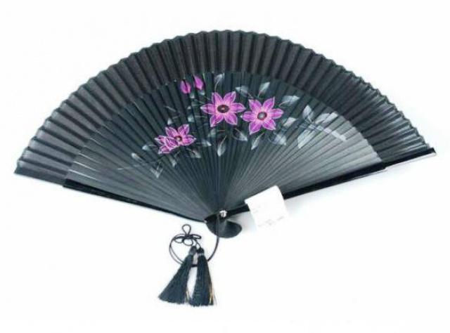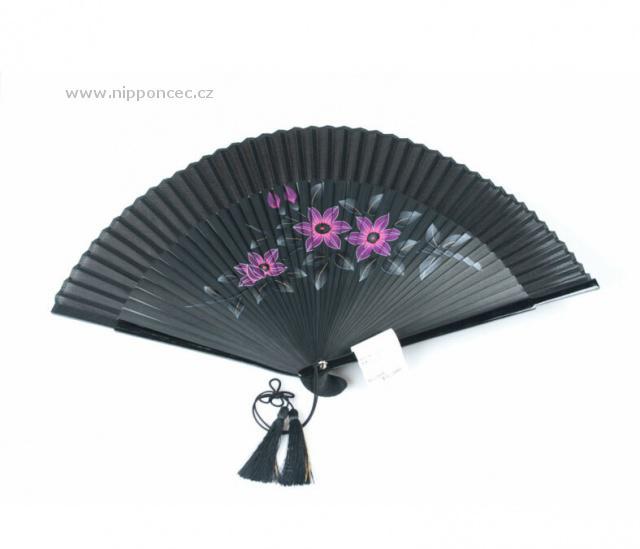 Půvabný originální japonský vějíř v černé barvě s motivem květů plaménku je zdobený černo zlatými střapci na černé hedvábné šňůrce. Luxusní vějíř je vyrobený dle tradice z bambusového dřeva a hedvábí.