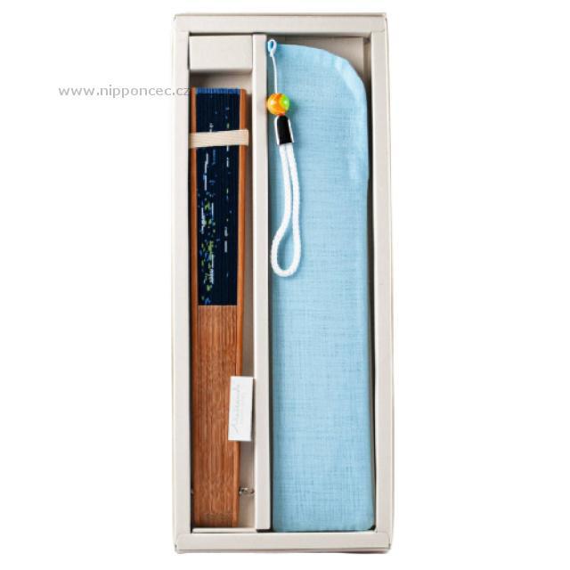 Elegantní japonský vějíř Sútra s motivem budhistického svatého písma psaného zlatou barvou na modrém pozadí. Sútra znamená doslovně vlákno nebo provaz, který drží věci pohromadě. Sútry vznikaly od nejstarších dob jako koncentrovaná, pro zapamatování vhodná vyjádření důležitých filozofických, náboženských i specializovaných odborných obsahů.