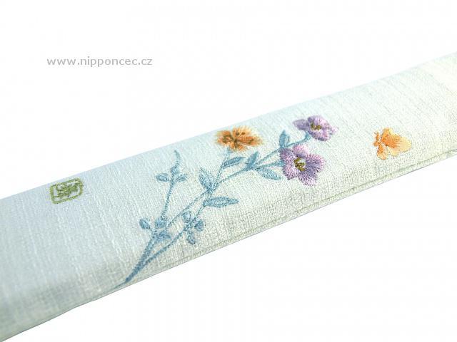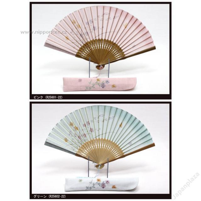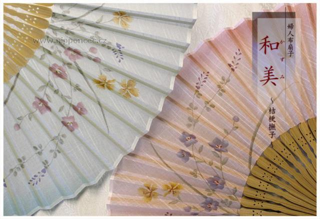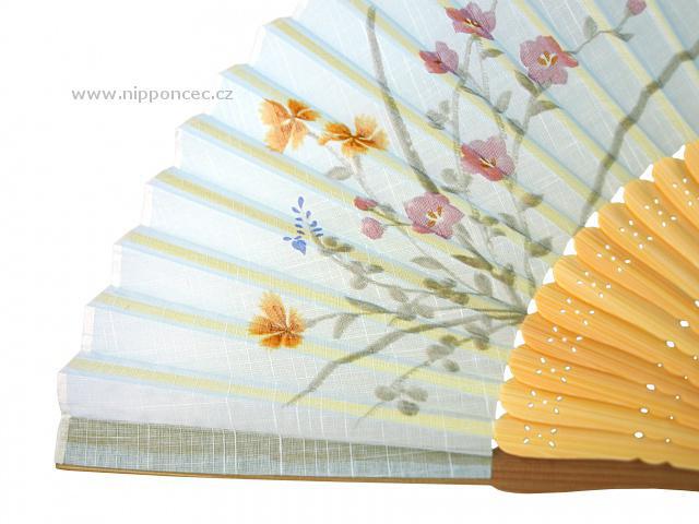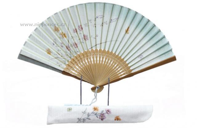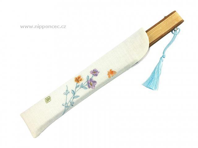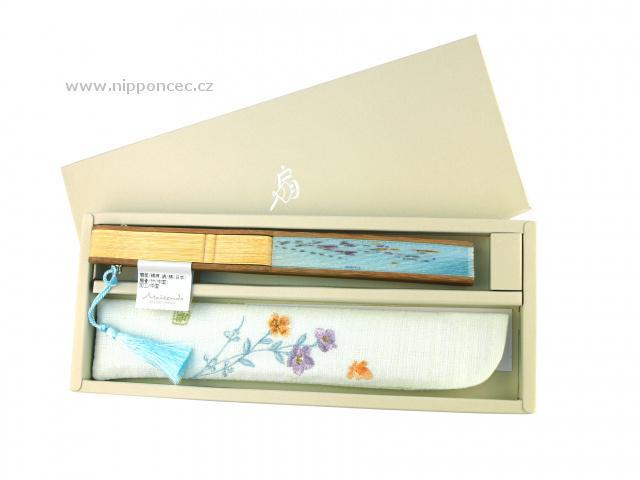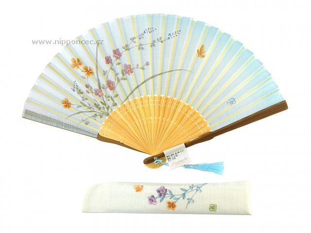 Ručně vyrobený elegantní vějíř v modré barvě je doplněn motivem polních a kokosových květů. Květy jsou mírně rozmazané, což vytváří velmi jemný a luxusní vzhled. Vějíř je vyroben dle tradice z bambusového dřeva a hedvábí. Velikost vějíře je 21 cm, v rozloženém stavu činí jeho šířka přibližně 38 cm. Vějíř od značky Maisendo je dodáván v dárkové krabičce s vyšívaným pouzdrem, bez stojánku.