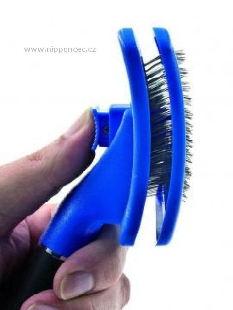 Velký široký drátkový kartáč self - cleaning, se samočisticím mechanismem - pro snadné odstranění vyčesaných chlupů z drátků kartáče. Drátky jsou jemné, zahnuté, z nerezové oceli. Aby rukojeť nesklouzávala z ruky, je opatřená pogumovanou úpravou. Kvalitní kartáč na zvířecí srst, vhodný pro větší plemena.
