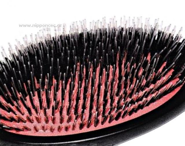 Kvalitní plochý kartáč na vlasy KELLER Exclusive 124 06 80 z bukového dřeva s černým lakem a pravými kančími štětinami na pneumatickém polštářku kombinované s nylonovými kolíčky.