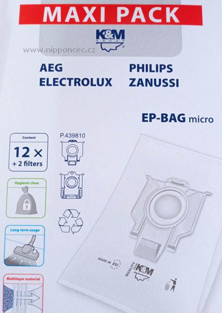 Sáčky z mikrovlákna od společnosti KM jsou složené ze 4 vrstev filtračního vlákna. Tento druh vysavačových sáčků poskytuje lepší průtok vzduchu ve srovnání s klasickým sáčkem do vysavače Také udržuje vysokou účinnost filtrace v průběhu vysávání (namísto papírového sáčku, kde dochází k poklesu výkonu, když je sáček již částečně plný).Díky vysokému stupni filtrace je i vzduch vycházející z přístroje výrazně čistší, ve srovnání s použitím sáčku z papíru. Vícevrstvý materiál sáčku zabraňuje roztržení či poškození sáčku. Micro sáček je flexibilní a perfektně padne do prachové komory vysavače určené pro sáček, takže se do něj vejde více nečistot - 3 sáčky z mikrovlákna vydrží stejně, jako 5 sáčků papírových. Sáčky jsou vhodné k vysavači Electrolux/Philips a dalším: - ELECTROLUX Airmax, ELECTROLUX Airmax GREEN
