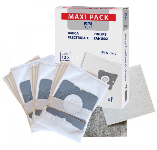 K&M Sáčky do vysavačů P15 MIC UNI-BAG 12ks textilní Balení univerzálních sáčků, vhodných do vysavačů široké škály: Alaska, Alpina, Bomann, Bravo, Clatronic, Concept, Dirt Devil, ECG, EIO, Electrolux, Eta, Fagor, Hoover, Imetec, Moulinex, Progress, Philips, Proline, Rohnson, Rowenta, Scarlett, Sencor, Severin, Solac, Taurus, TCM, Tesla Team, Tristar, Ufesa, Vitek, Zanussi a dalších. 12 sáčků v balení a 2 filtry k zastřižení.