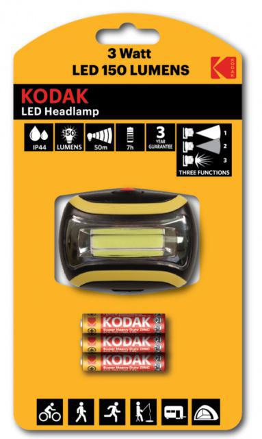 Čelovka Kodak, výkon - 3W, dosah svícení - 50m, 3 polohy světla - 100/50/25%, svítivost - 70 lumen, vodotěsnost - IP44, rozměry:69mm x 49mm x 49 mm, váha: 89g, provoz: 3x AAA baterie LR03 Kodak (součástí balení).