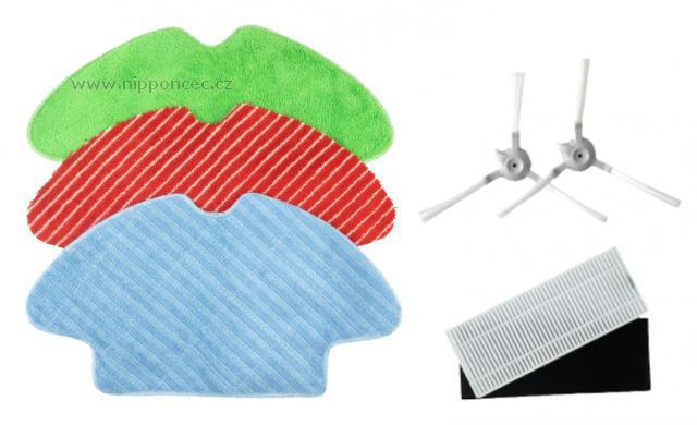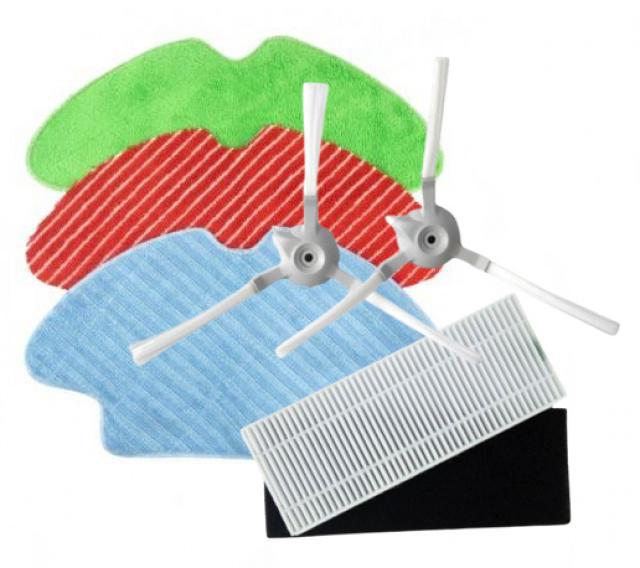 2 boční kartáčky do rohů a obtížně přístupných zón,1 hadřík z mikrovlákna s vysokou hustotou na odstranění zvířecích chlupů a houževnatých skvrn (červený hadřík), 1 běžný hadřík z mikrovlákna se střední hustotou: šetrný, vhodný na všechny typy podlah včetně křehkých povrchů (modrý hadřík), 1 alergický hadřík z chmýří: Používá se bez vody k odstranění jemných částic pomocí statické elektřiny (zelený hadřík)1+1 filtr  až 99,9% filtrace alergenů z prachu