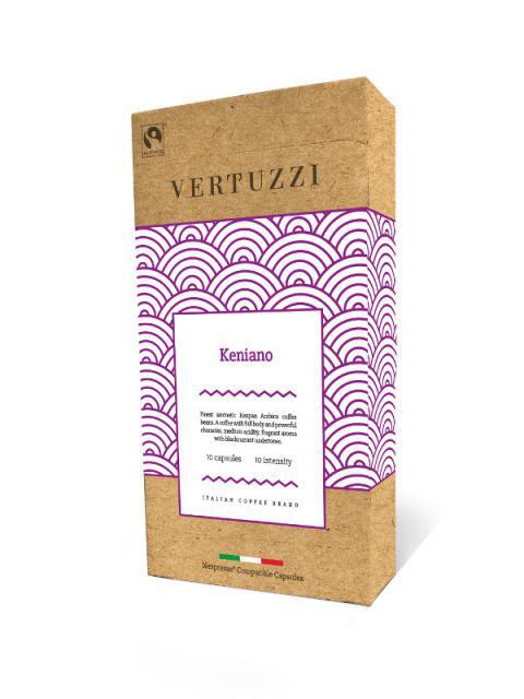 Kompostovatelné kapsle Vertuzzi Keniano pro Nespresso obsahuje výběr těch nejlepších zrn Arabiky z Keni, je to jedinečná káva plné chuti, střední kyselosti s jemnými tóny černého rybízu. Kapsle Vertuzzi Keniano nesou označení Fair trade. Kapsle jsou celé vyrobeny z certifikovaného kompozitního papíru s membránou, pro zachování plné čerstvosti kávy. Kapsle jsou zcela biologicky rozložitelné již za 12 týdnů.