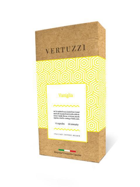 Kompostovatelné kapsle Vertuzzi Vaniglia pro Nespresso obsahují mletá vybraná zrna 100% Arabiky ze Střední a Jižní Ameriky s jemnou přírodní vanilkovou příchutí. Tato káva se hodí pro přípravu espressa, cappuccina a hlavně vynikajícího Vanilla Latte. Kapsle jsou celé vyrobeny z certifikovaného kompozitního papíru s membránou, pro zachování plné čerstvosti kávy. Kapsle jsou zcela biologicky rozložitelné již za 12 týdnů.