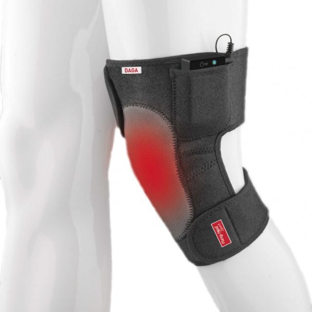 Vyhřívaná kompresní bandáž značky Daga je navržená pro neomezující pohyb kolene při současném zajištění jeho nahřívání. Energii pro ohřev dodává integrovaná baterie, která neomezuje pohyb, avšak zajišťuje dvě funkce, kompresi a teplo nutné pro léčbu nebo regeneraci.