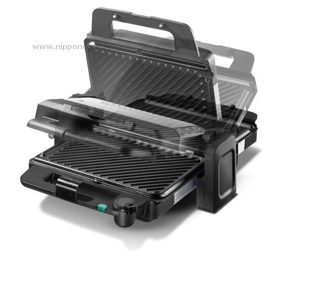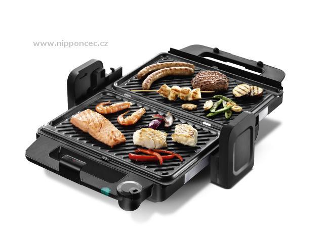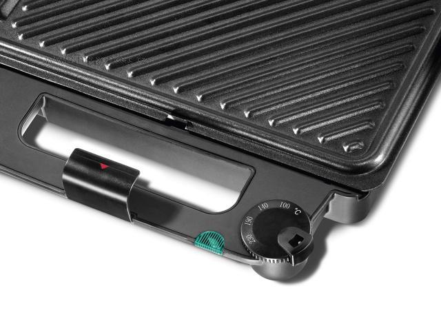 Gril má ve spodní části také schránku na tuk, který nestéká tam, kam nechcete. Kontaktní gril je vybaven plynule nastavitelným termostatem pro optimální propečení pokrmu - 100 - 230 stupňů