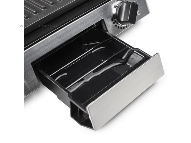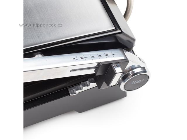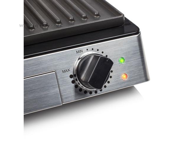 Kontaktní gril má dvě světelné kontrolky pro komfortní obsluhu - ihned víte, kdy je gril dostatečně předehřátý a lze na něj vložit potravinu. Skvělé je výškové polohování - pokud připravujete steak se sýrem, máte jistotu, že se vám sýr na vrchní ploténku nepřilepí. Na spodní části výrobku jsou umístěny protiskluzové nožky proti sklouznutí z kuchyňské desky. Termostat je plynule regulovatelný pro různé druhy potravin. Vysoký výkon 2000W - u stolu nebude ani větší počet strávníků dlouho čekat. Proč ano? Nerezové víko, vysoký výkon, plynule nastavitelný termostat, vyřešený odvod přebytečného tuku, lze použít jako stolní gril, výjimatelné plotny - plná výbava za dobrou cenu.