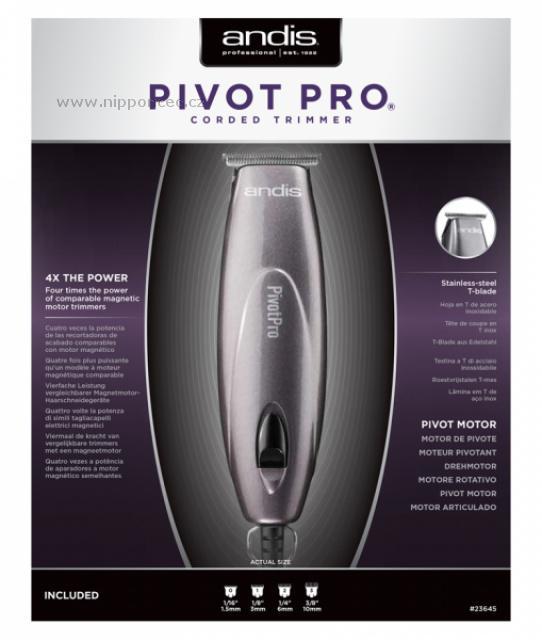 Nový profesionální strojek Andis PivotPro T-Blade Trimmer je vhodný pro všechny typy vlasů a vousů. Díky kvalitní nerezové střihací hlavici T-Blade je ideální pro konturování a tvarování linií, vousů a knírů. Hlavice je osazena jemnými zuby pro extrémně přesné tvarování. Navíc disponuje silným vibračním motorem, který je čtyřnásobně silnější oproti jiným magnetickým motorů. Součástí balení jsou 4 přídavné hřebeny.
