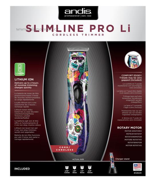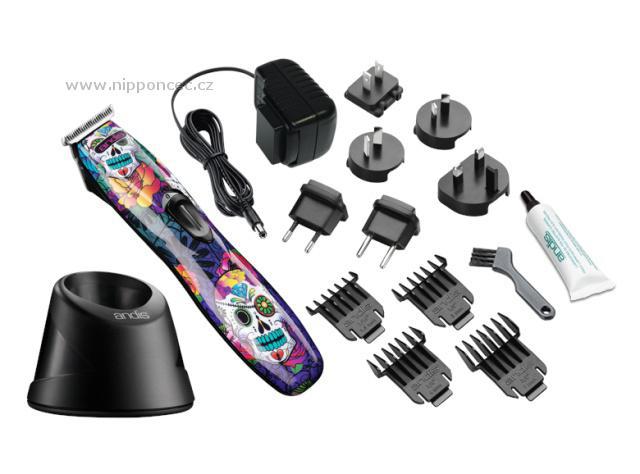 Konturovací strojek od americké značky ANDIS - SlimLine Pro Li T-Blade skvělá volba pro tvarování krčních linií, plnovousů a knírů v jedinečném designu s motivem lebek a květin v duchu mexického svátku Día de los Muertos. Akumulátorový profesionální zastřihovač vlasů s otočným motorem o šíři hlavice 32 mm je vybaven Li-Ion baterií, která výdrží na jedno nabití 120 minut provozu.