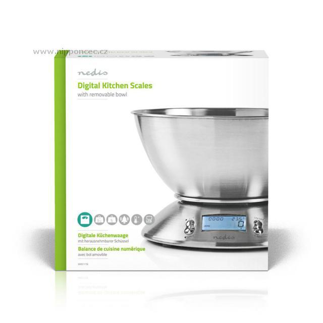 Nedis digitální kuchyňská váha s kvalitní vyjímatelnou nerezovou mísou vám pomůže snadno odměřit ingredience a zároveň se stane atraktivním doplňkem vaší kuchyně. Maximální váživostí váhy je 5 kg s přesností vážení na 1 g. Dále je vybavena časovačem, indikátorem nízkého stavu baterie, indikátorem přetížení, automatickým vypnutím a snímačem teploty od 0 – 40 °C.
