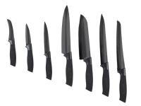 Sada 7 nožů z nerezové oceli s titanovým povrchem a ergonomickou pogumovanou rukojetí pro bezpečné a pevné uchopení. Sada se skládá z univerzálních nožů, nože Santoku a z nožů na krájení chleba, sýrů, zeleniny a masa. Titan je netoxický materiál, který neovlivňuje chuť jídla. . Velikost: od 8,5 až po 20 cm.