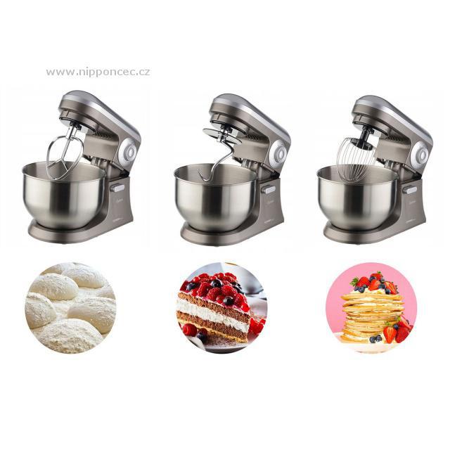 Kuchyňský robot s hnětacím hákem a metlou, je výborným pomocníkem do kuchyně, pro přípravu různých druhů těsta, šlehání i mixování. Ovládá se jednoduše pomocí přepínače na předním panelu. Součástí kuchyňského robota je nerezová mísa o obsahu 6,5 litru ve výkyvném stojanu, který usnadňuje manipulaci s robotem. Šlehač je opatřen 10 rychlostmi a pulsní rychlostí pro krátké, nebo silné rázy šlehání či mixování. Stabilní základnu tvoří gumové nožky proti sklouznutí po kuchyňské lince.