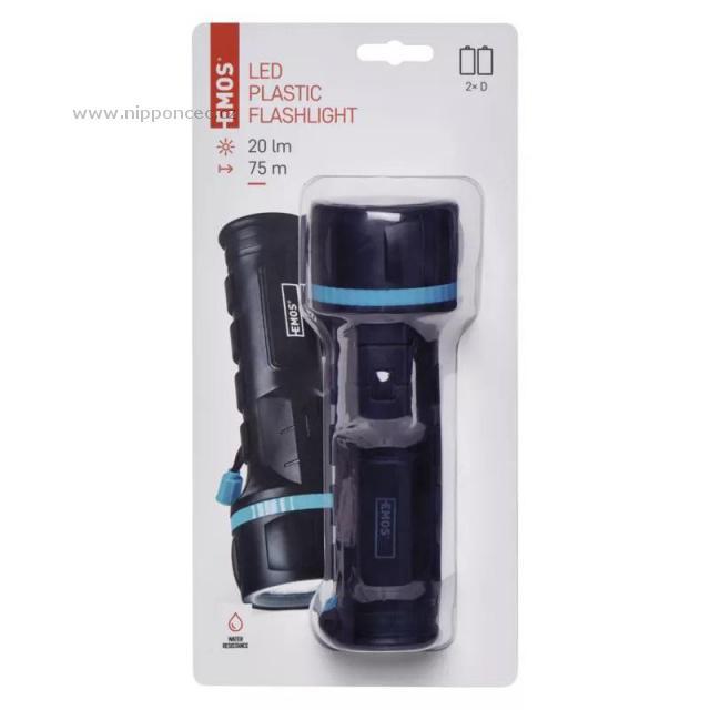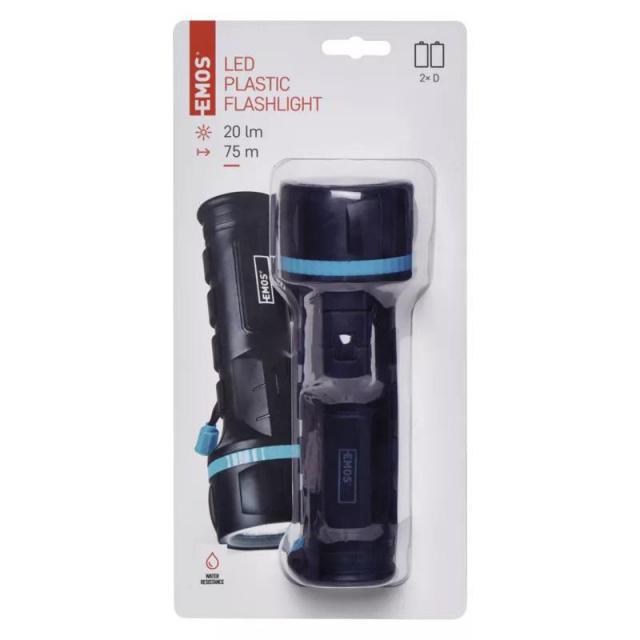 Praktická LED baterka EMOS M00375 je vhodná při kempování, na chatu nebo jako alternativní zdroj světla při výpadku energie v domácnosti. Je napájena 2 x D/R20 bateriemi s dobou svícení cca 140 hodin. Dosvit svítilny činí 75 metrů.