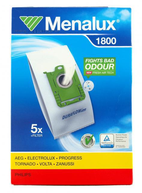 Proč zvolit sáčky do vysavače Menalux 1800 z netkané textilie DURAFLOWTM Fresh: Menalux DURAFLOWTM Fresh = výjimečný sáček: Nové provedení sáčků syntetických sáčků Menalux (to poznáte podle označení na krabici (NEW - Fresh AIR TECH = FIGHTS BAD ODOUR) brání nepříjemným pachům jako jsou odpadky, pach z domácích mazlíčků, pot, cigaretový kouř, aromatické druhy zeleniny jako například cibule, a jiné, v úniku po vysávání ze sáčku. Některé provedení sáčků z netkané textilie je k dispozici pouze v původním provedení, postupně společnost Menalux přechází na provedení nové. Až o 50% delší doba použitelnosti: Syntetické prachové sáčky Menalux z patentovaného materiálu DURAFLOWTM fresh vydrží ve vysavači o dobu až o 50 % delší než normální papírový sáček. Nová struktura materiálu brání snížení sacího výkonu při postupném zaplňování sáčku.