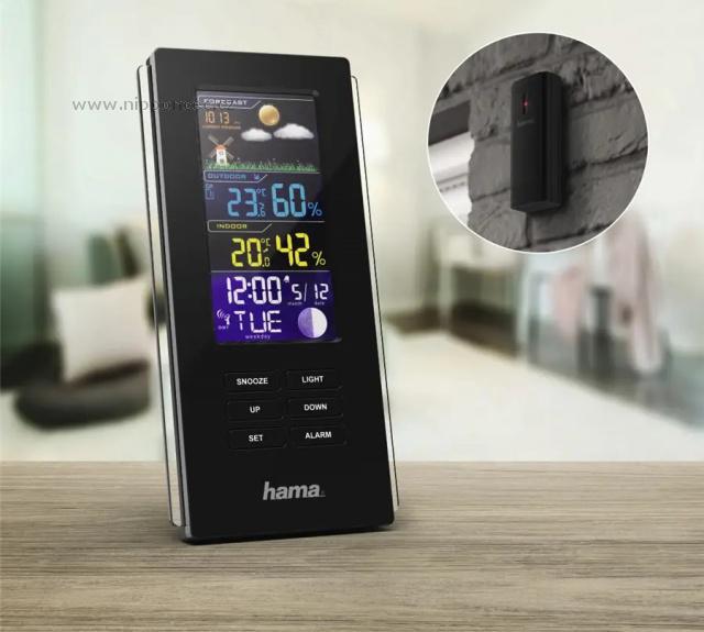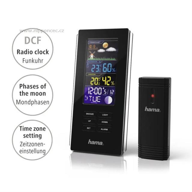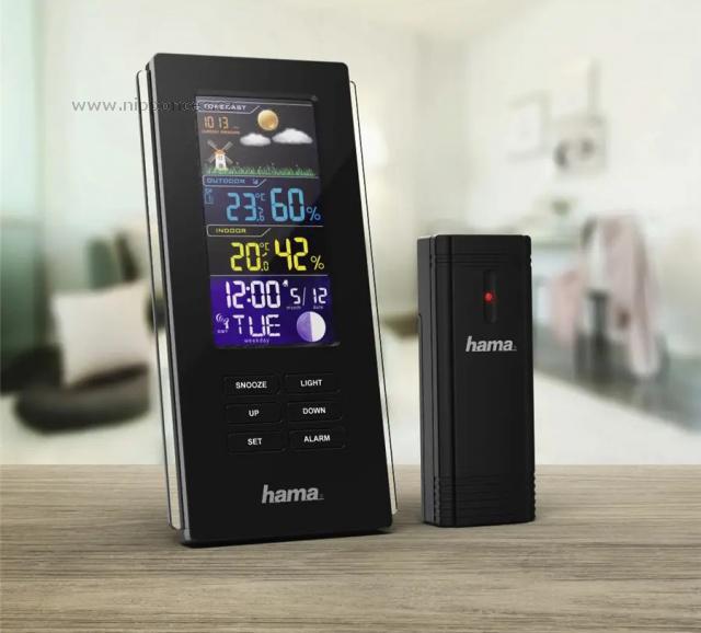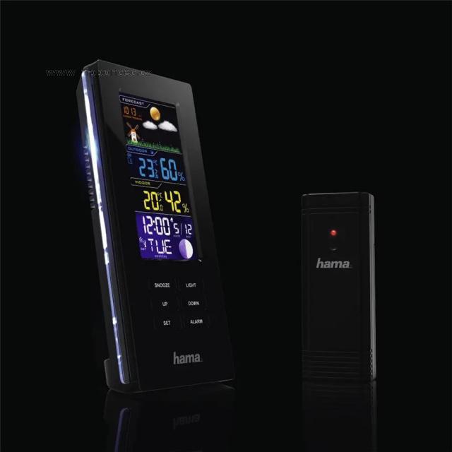 Digitální meteostanice Hama Color Edge měří aktuální teplotu a vlhkost vzduchu venku i v místnosti. Barevný displej také zobrazuje tlak vzduchu, fáze měsíce, datum, čas, den v týdnu a předpověď počasí pomocí čtyř symbolů: jasno, polojasno, oblačno a déšť. Bezdrátový venkovní senzor má ve volném prostranství dosah až 30 m a data přenáší do meteostanice prostřednictvím signálu s frekvencí 433 MHz. Je napájen 2 x AA Mignon bateriemi, které jsou součástí balení stejně jako 3 x AAA Micro baterie určené pro základnu. Tu můžete zapojit i do elektrické sítě, pokud chcete mít displej podsvícený nepřetržitě. Napájecí zdroj však není součástí balení. Meteostanice je také vybavena dvěma budíky s funkcí odloženého buzení/dřímání (Snooze).