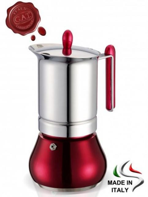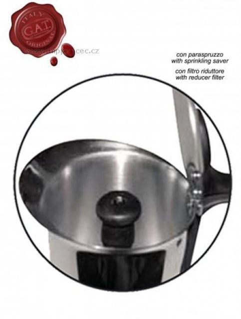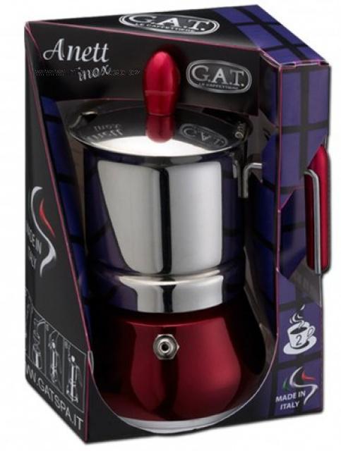 Přetlakový kávovar - moka konvice - také se někdy nazývá perkolátor, G.A.T. je vyrobený ze zdravotně nezávadného aluminia v kombinaci s nerezovou ocelí a je určený pro elektrické, sklokeramické, plynové ploténky. Moka konvička má ergonomickou rukojeť a knoflík na víku z horkuodolného plastu, bezpečnostní přetlakový ventil a povrch s úpravou pro snadnou údržbu - vše, co potřebujete pro přípravu výborné kávy, kterou s ním připravíte snadno a osvědčeným způsobem, který se po léta nezměnil. Těsnění kávovaru je silikonové, výměnné, s úchytem pro snadné vyjmutí.