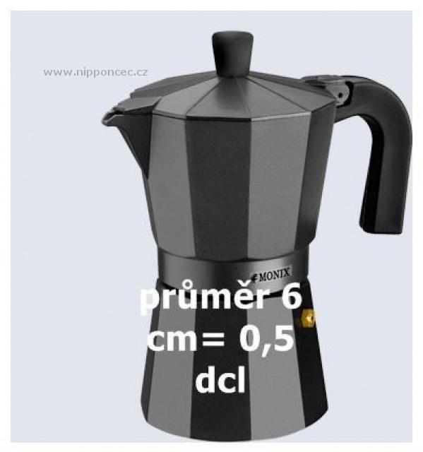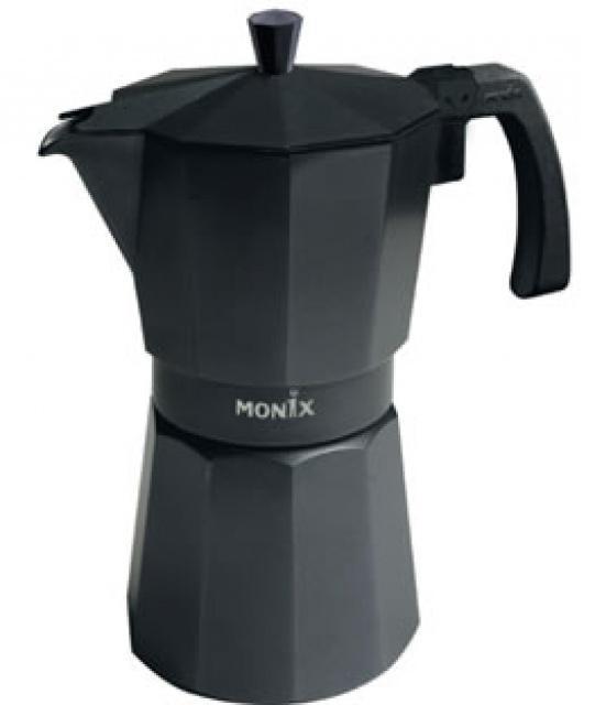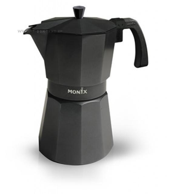 Hliníková moka konvice na 1 šálek kávy. Přetlakový kávovar v černé barvě, pro tradiční přípravu italské kávy s vynikajícím aroma a jedinečnou chutí. Moka konvička je opravdu maličká, průměr 6 cm. Přetlakový kávovar, také se někdy nazývá perkolátor, Monix je vyrobený ze zdravotně nezávadného aluminia a je určený pro elektrické, sklokeramické a plynové ploténky. Moka konvička má ergonomickou rukojeť a knoflík na víku z horkuodolného plastu, bezpečnostní přetlakový ventil a povrch s úpravou pro snadnou údržbu. Vše, co potřebujete pro přípravu výborné kávy, kterou s ním připravíte snadno a osvědčeným způsobem, který se po léta nezměnil.