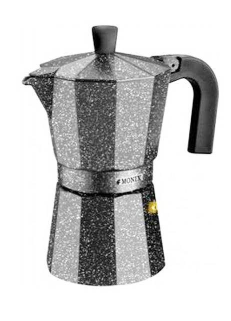 Hliníková moka konvice na 3 mocca šálky kávy, Monix Vitro Rock 3 šálky. Přetlakový kávovar s dekorem kamene pro tradiční přípravu italské kávy s vynikajícím aroma a jedinečnou chutí. Přetlakový kávovar, také se někdy nazývá perkolátor, Monix je vyrobený ze zdravotně nezávadného aluminia a je určený pro elektrické, sklokeramické a plynové ploténky. Moka konvička má knoflík na víku z horkuodolného plastu, bezpečnostní přetlakový ventil a povrch s úpravou pro snadnou údržbu. Vše, co potřebujete pro přípravu výborné kávy, kterou s ním připravíte snadno a osvědčeným způsobem, který se po léta nezměnil.