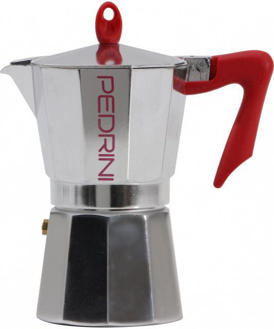 Hliníková moka konvice na 3 šálky kávy - 150 ml, se zrcadlově lesklým povrchem a ouškem a držadlem v červené barvě. Přetlakový kávovar (někdy se také nazývá perkolátor), pro tradiční přípravu italské kávy s vynikajícím aroma a jedinečnou chutí je vyrobený ze zdravotně nezávadného aluminia a je určený pro elektrické, sklokeramické a plynové ploténky, tedy pro všechny, s výjimkouindukce. Moka konvička Pedrini má ergonomickou rukojeť a knoflík na víku z horkuodolného plastu (max 210°C), bezpečnostní přetlakový ventil a povrch s úpravou pro snadnou údržbu. Vše, co potřebujete pro přípravu výborné kávy, kterou s ním připravíte snadno a osvědčeným způsobem, který se po léta nezměnil.