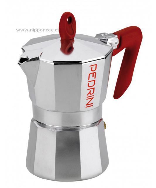 Hliníková moka konvice na 6 šálků kávy - 300 ml, se zrcadlově lesklým povrchem a ouškem a držadlem v červené barvě. Přetlakový kávovar (někdy se také nazývá perkolátor), pro tradiční přípravu italské kávy s vynikajícím aroma a jedinečnou chutí. Je vyrobený ze zdravotně nezávadného aluminia a je určený pro elektrické, sklokeramické a plynové ploténky, tedy pro všechny, s výjimkouindukce. Moka konvička Pedrini má ergonomickou rukojeť a knoflík na víku z horkuodolného plastu (max 210°C) , bezpečnostní přetlakový ventil a povrch s úpravou pro snadnou údržbu. Vše, co potřebujete pro přípravu výborné kávy, kterou s ním připravíte snadno a osvědčeným způsobem, který se po léta nezměnil.