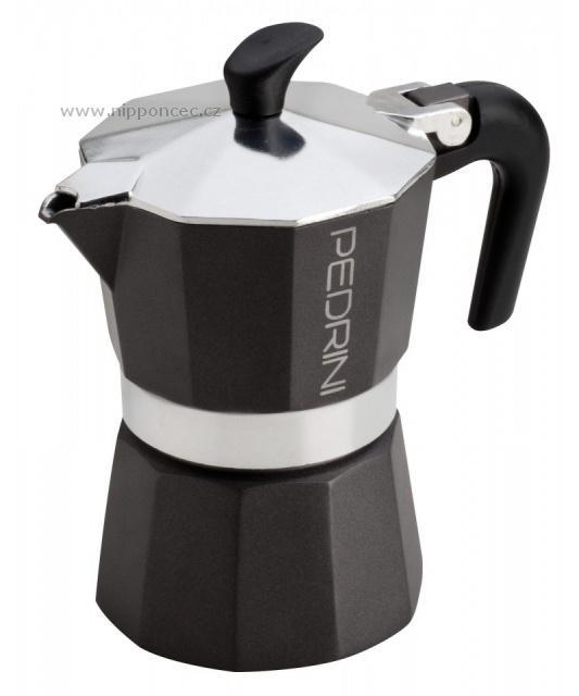 Hliníková moka konvice na 6 šálků kávy - 300 ml, v černošedé barvě v kombinaci se stříbrnou (aluminium). Přetlakový kávovar (někdy se také nazývá perkolátor), pro tradiční přípravu italské kávy s vynikajícím aroma a jedinečnou chutí je vyrobený ze zdravotně nezávadného aluminia a je určený pro elektrické, sklokeramické a plynové ploténky, tedy pro všechny, s výjimkou indukce. Moka konvička Pedrini má ergonomickou rukojeť a knoflík na víku z horkuodolného plastu (max 210°C), bezpečnostní přetlakový ventil a povrch s úpravou pro snadnou údržbu. Vše, co potřebujete pro přípravu výborné kávy, kterou s ním připravíte snadno a osvědčeným způsobem, který se po léta nezměnil.