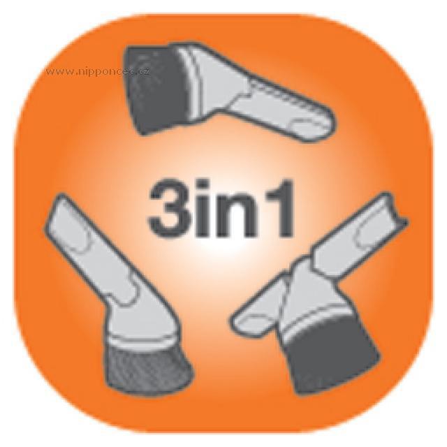 nabízí tři vysávácí nástavce v jednom, které vysají takřka každý malý povrch ve vaší domácnosti. Hubice 3in1 zahrnuje: kartáčovou hubici pro oprašování knihoven, stolů a dalšího nábytku, štěrbinovou hubici, která je ideální pro vysávání úzkých míst mezi spotřebiči, mezi radiátory, ve škvírách a štěrbinách v pohovce a hubici na čalounění k vysávání měkkého bytového vybavení, rolet, závěsů, záclon. Hubice je určena pro všechny vysavače s kruhovým průměrem připojení příslušenství 32 a 35 mm. Součástí balení je adaptér.